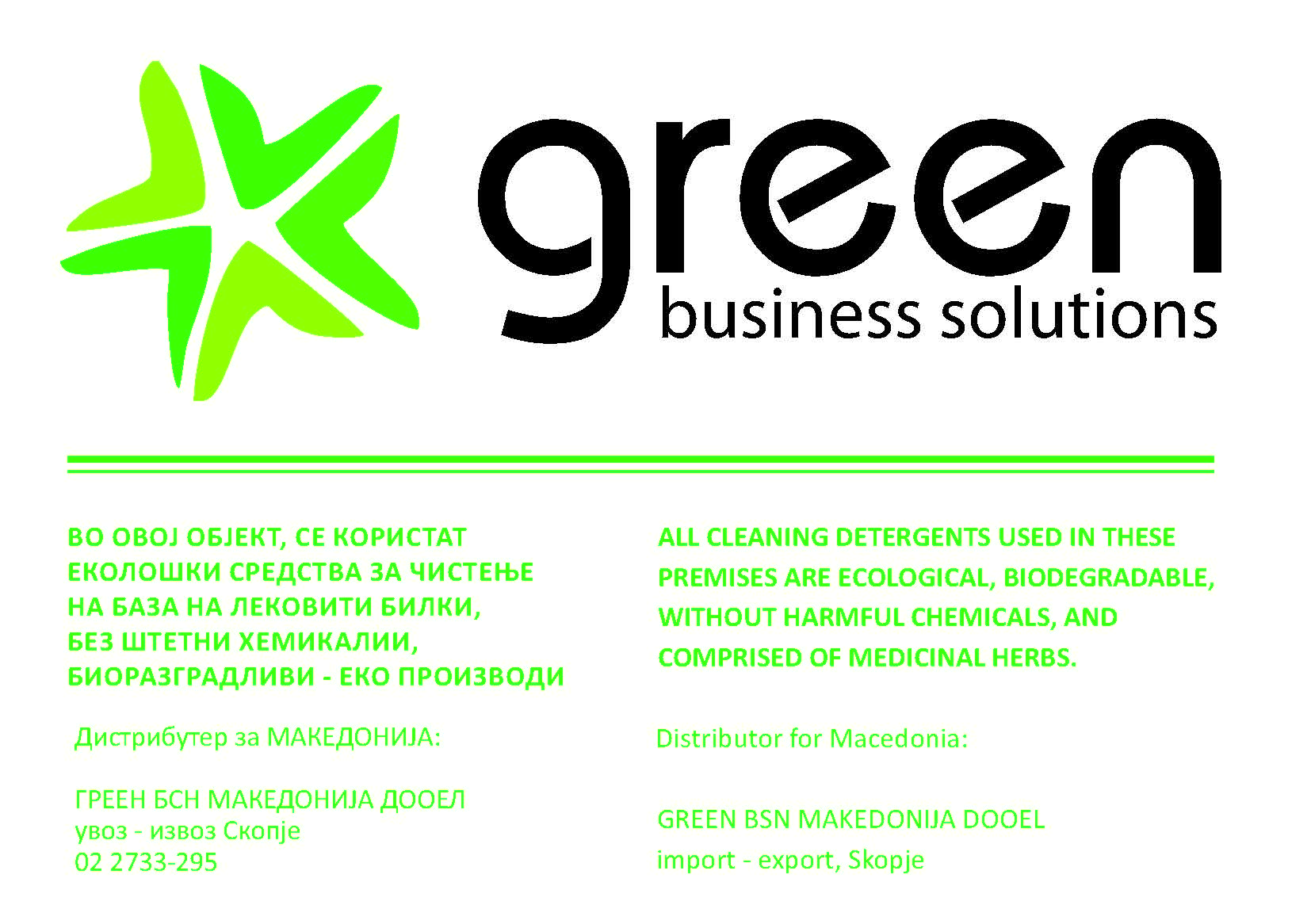 GREEN BUSINESS SOLUTIONS e фирма отворена oд 2011. Година. Фирмата работи на едукација на луѓе за потребата да се променат навиките и начинот за зачувување на здравјето.Од таа причина константно се усовршуваат и развиваат нови,здрави технологии кои се вградуваат во „Green”- производите. Центарот за развој и производство во рамките на сопствени погони се наоѓаат во Нови Сад. Широка лепеза „Green” производи за лична и домашна хигиена на билна база,допринесува за смалување и спречување на алергии, проблеми со кожата, дишните органи и др.